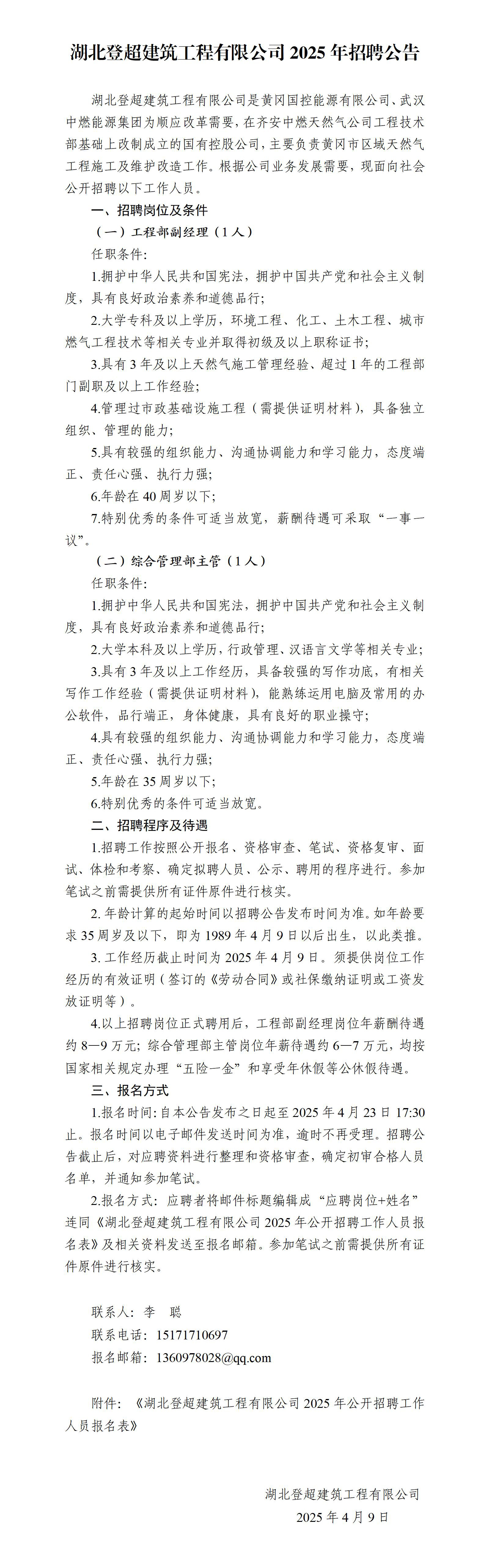 湖北登超建筑工程有限公司2025年招聘公告
